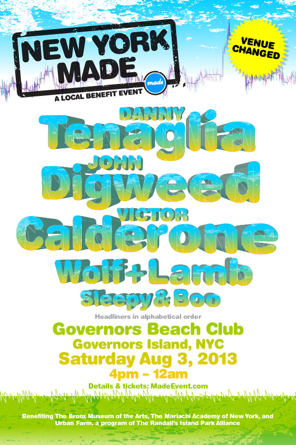 This weekend Made Event is proud to present NEW YORK MADE, a one-of-a-kind, daytime to nighttime summer benefit event at Governors Beach Club on Governors Island on Saturday, August 3, 2013 from 4 p.m. to 12 a.m. New York Made’s A-list lineup highlights the Big Apple’s own with Danny Tenaglia, Victor Calderone, Wolf + Lamb and Sleepy & Boo, with special guest and honorary New Yorker, John Digweed.